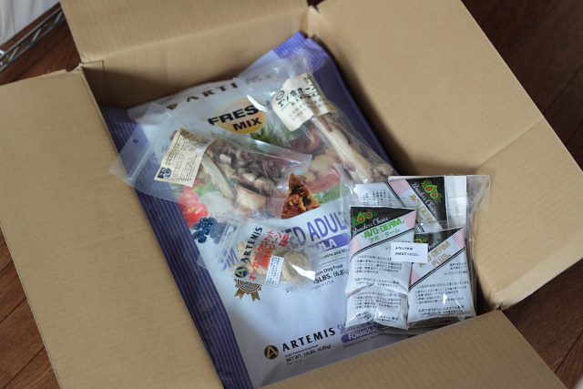 2日前にネットで注文したことをすっかり忘れていたエースの主食”アーテミス”と野性を取り戻すための必須アイテム”骨”が届いた 今回はフードのサンプルも付いてた こーゆーのってちょっとうれしかったりするよね