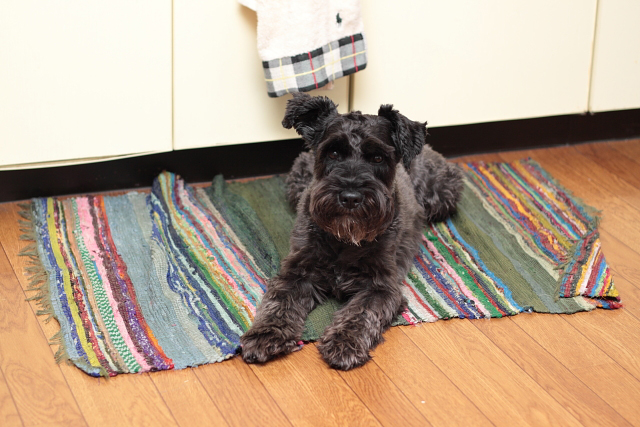 見た目的にはキッチンマットってか”その辺の布”って感じ丸出しだけど 明るい感じでいいんじゃないでしょうか ご覧の通りエースも早速気に入ってるみたいだしさ